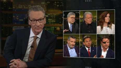 The late-night host then played a montage of conservatives appearing on Real Time and taking his rhetorical beating. He showed none of their answers, just the beatdowns. He displayed former Speaker of the House Kevin McCarthy, former Attorney General Bill Barr, Florida Governor Ron DeSantis, Senator Ted Cruz, and MAGA podcaster Steve Bannon.