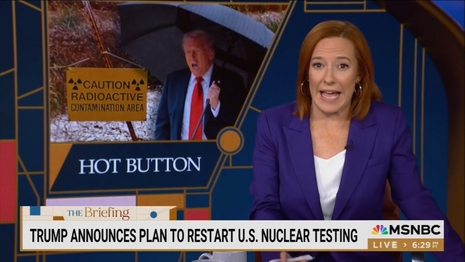 Psaki then facetiously brought up the recent fiasco inside the Pentagon over a new Netflix film, A House of Dynamite, “So clearly that movie struck a nerve inside the Trump administration. Could it have gotten under Trump’s skin, too? Could it have prompted, let’s say, a surprise announcement post about resuming nuclear tests? We don’t know.”